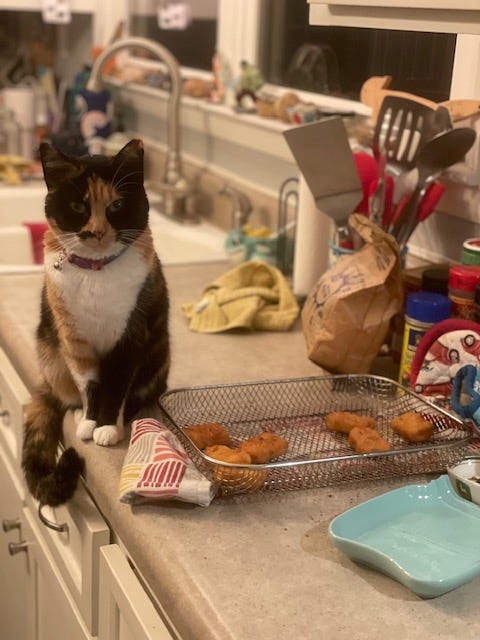 Here’s Idgie (Imogene Ruth) guarding the chicken nuggets like they belong to her.
